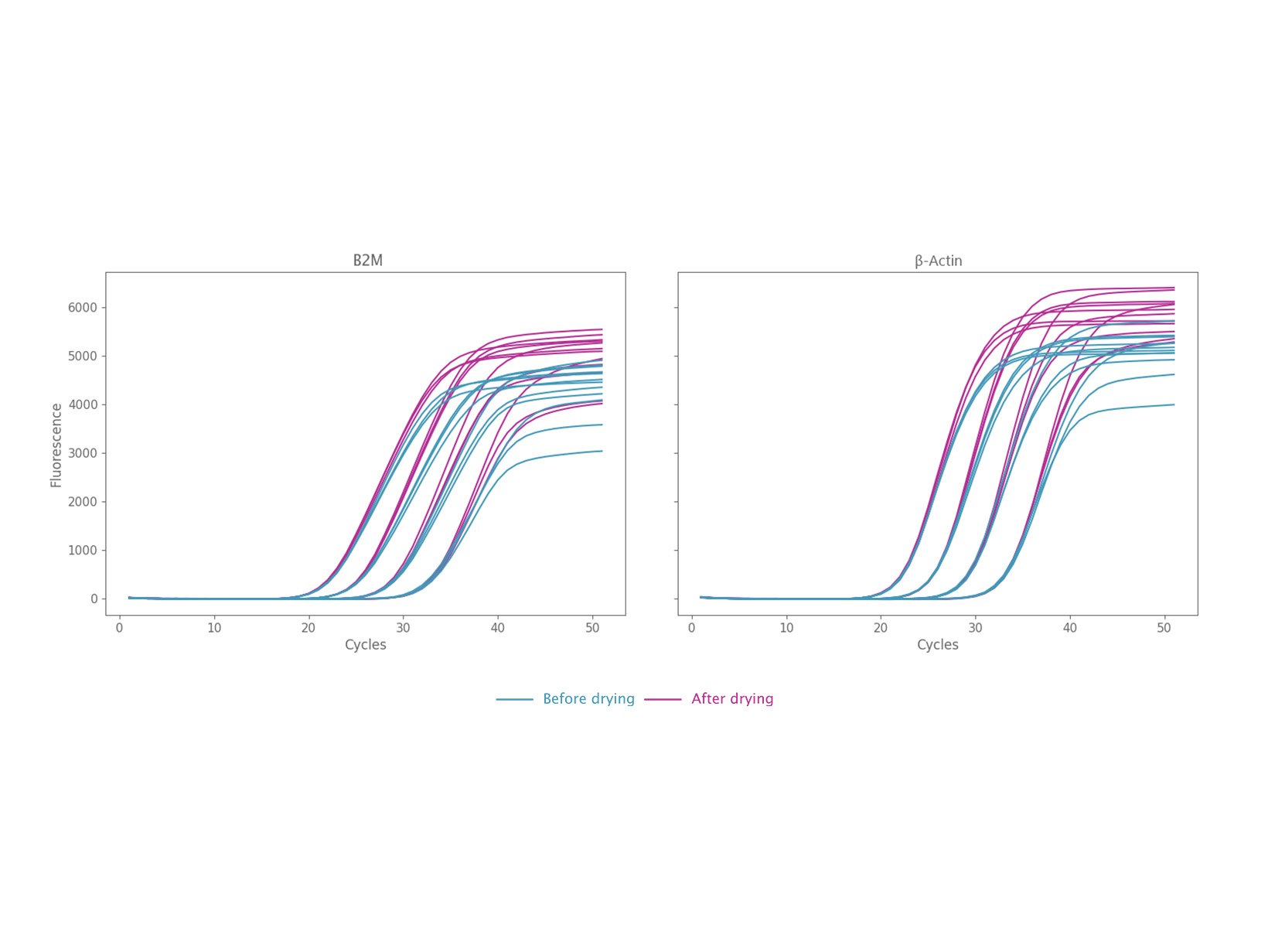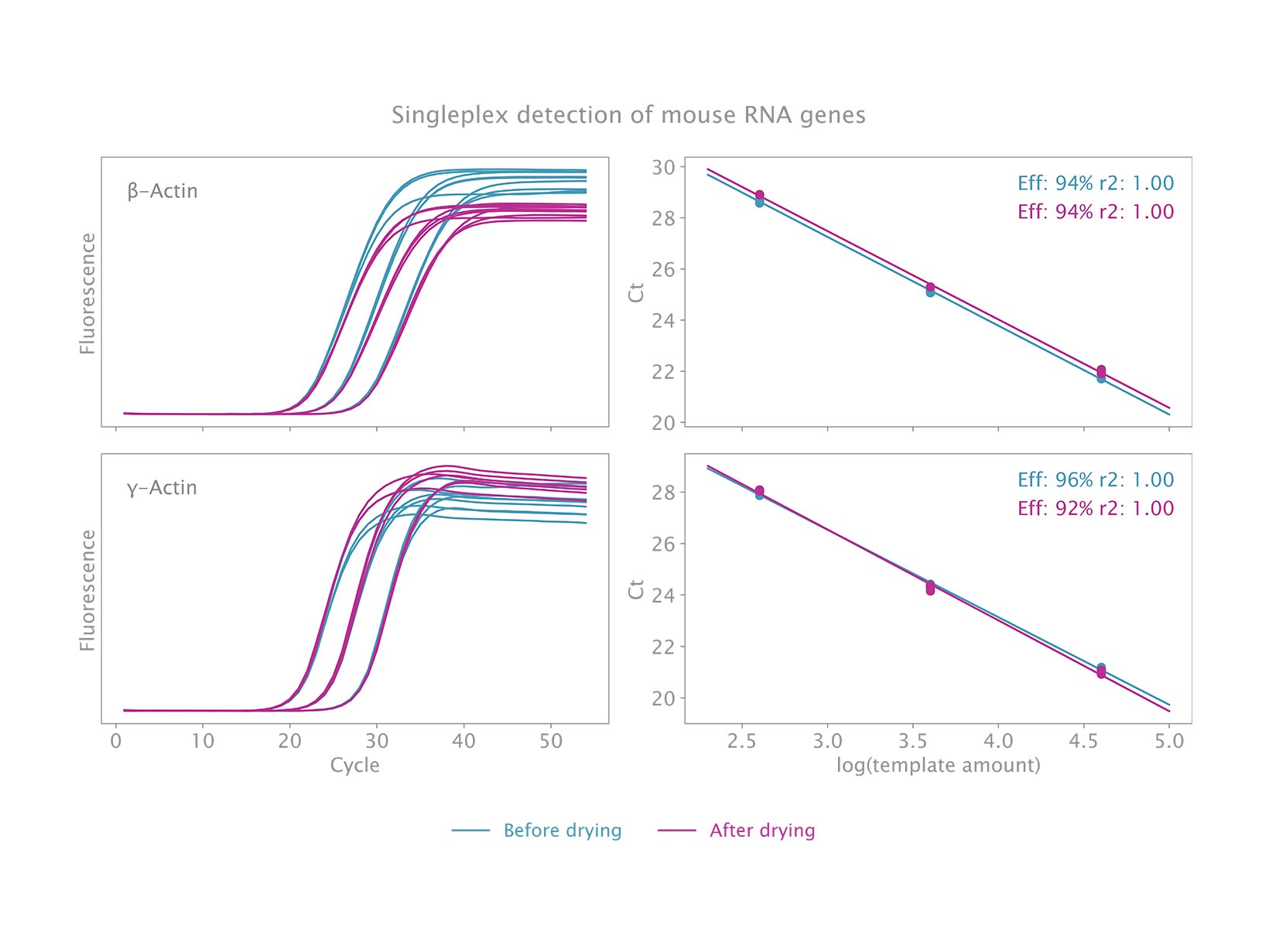 Hỗn hợp khô hành xử tương tự như hỗn hợp ướt, không có sự giảm đáng kể về độ phát quang hoặc độ trễ trong khuếch đại. Nó cũng cho thấy cùng độ nhạy và hiệu quả như tất cả các hỗn hợp Probe 1-Step của chúng tôi, phát hiện tới 4 bản sao của bộ gen virus.