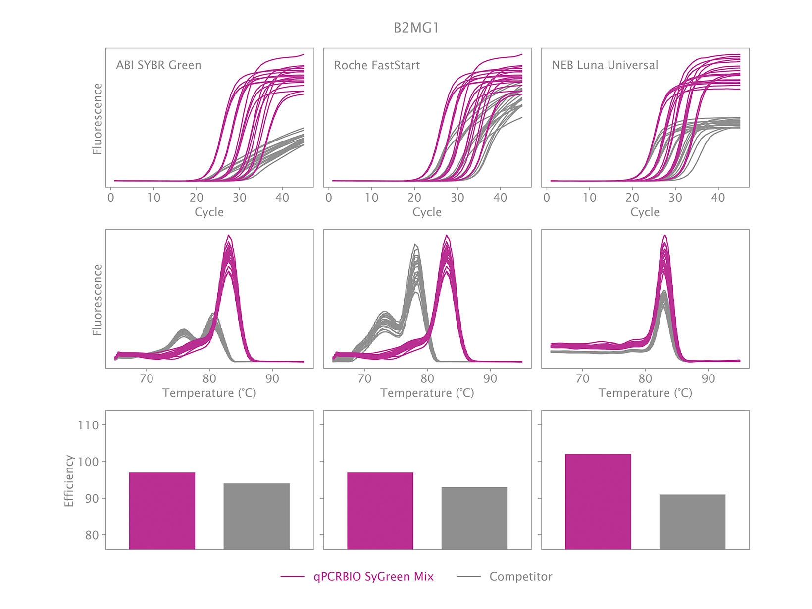 Hỗn hợp 2x của chúng tôi sử dụng một thuốc nhuộm intercalating DNA độc quyền, không cản trở PCR, không giống như các thuốc nhuộm huỳnh quang phổ biến khác. Những cải tiến làm tăng độ nhạy và tính đồng nhất của qPCRBIO SyGreen® Mix trong điều kiện chu kỳ tiêu chuẩn cũng cho phép hiệu suất hàng đầu trong điều kiện chu kỳ nhanh và siêu nhanh.